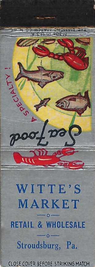 Witte’s Market Retail & Wholesale Witte’s Market Retail & Wholesale This matchcover also appears in the following categories:C-D-EDistributor & WholesaleFish & LobsterMarketPennsylvaniaStock Designs